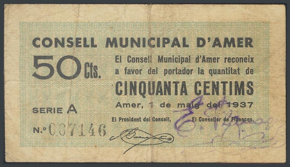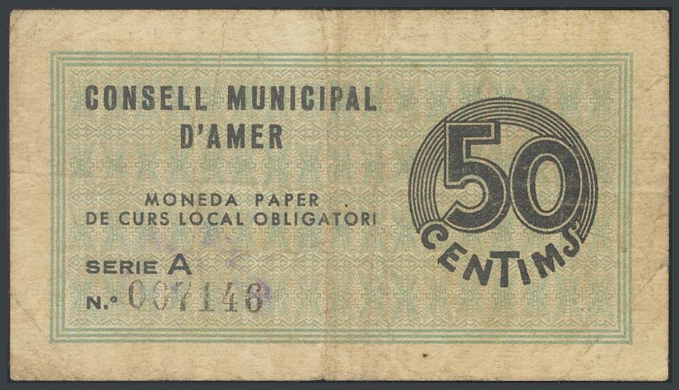 AMER (GERONA). 50 Céntimos. 1 de Junio de 1937. Serie A. (González: 6246). MBC.