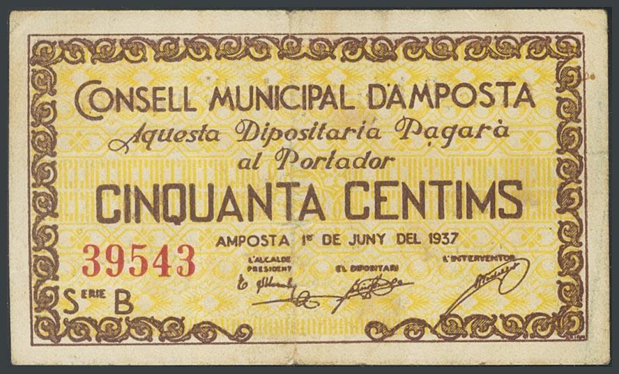 AMPOSTA (TARRAGONA). 50 Céntimos. 1 de Junio de 1937. (González: 6275). MBC+.