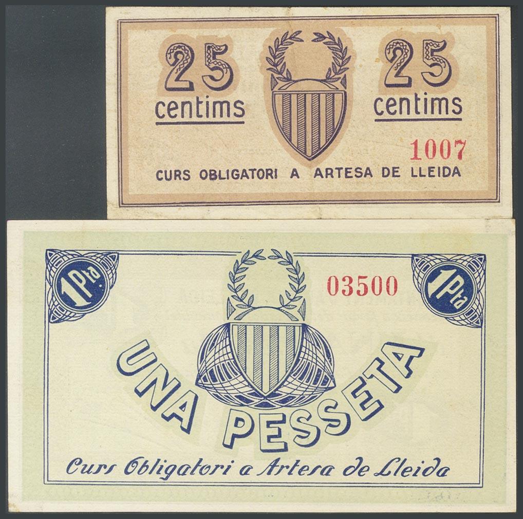 ARTESA DE LLEIDA (LERIDA). 25 Céntimos y 1 Peseta. 20 de Junio de 1937. (González: 6423, 6425). EBC.