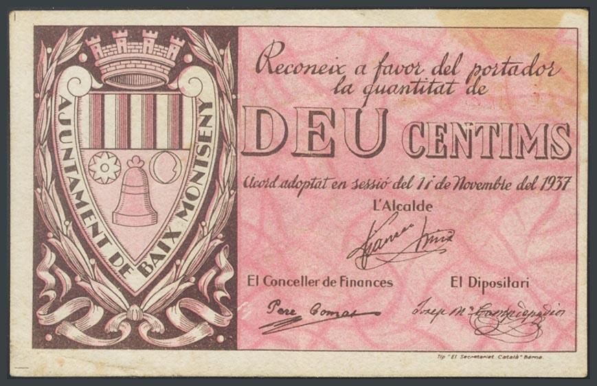 BAIX MONTSENY (BARCELONA). 10 Céntimos. 17 de Noviembre de 1937. (González: 6480). MBC+.