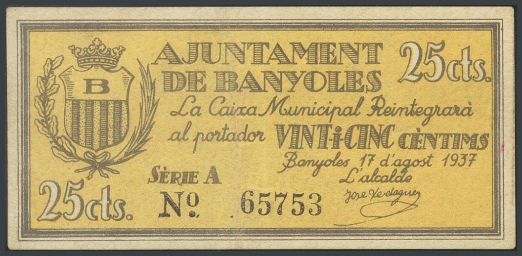 BANYOLES (GERONA). 25 Céntimos. 17 de Agosto de 1937. Serie A. (González: 6506). MBC.