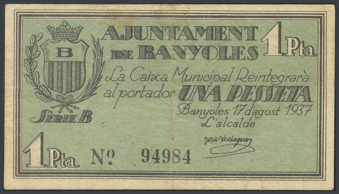 BANYOLES (GERONA). 1 Peseta. 17 de Agosto de 1937. (González: 6507). MBC.