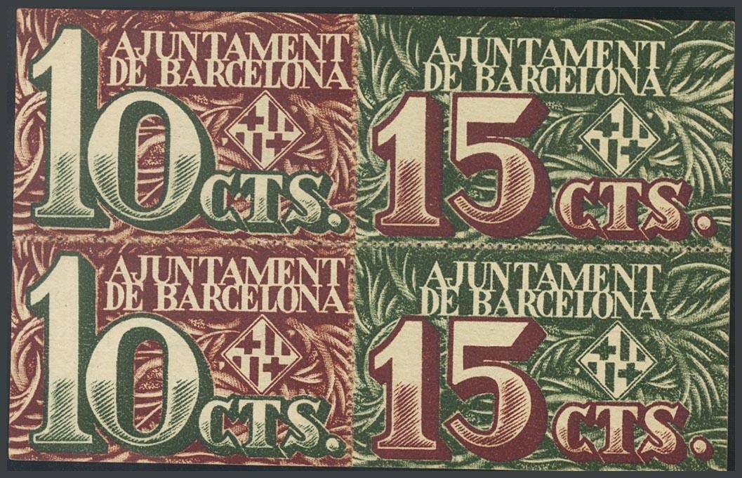 BARCELONA. 10 Céntimos (2) y 15 Céntimos (2). 2 de Diciembre de 1937. Serie A y B, Impreso en bloques de 4 billetes (dos de 10 cts y dos de 15 cts). (González: 6523/24). EBC.