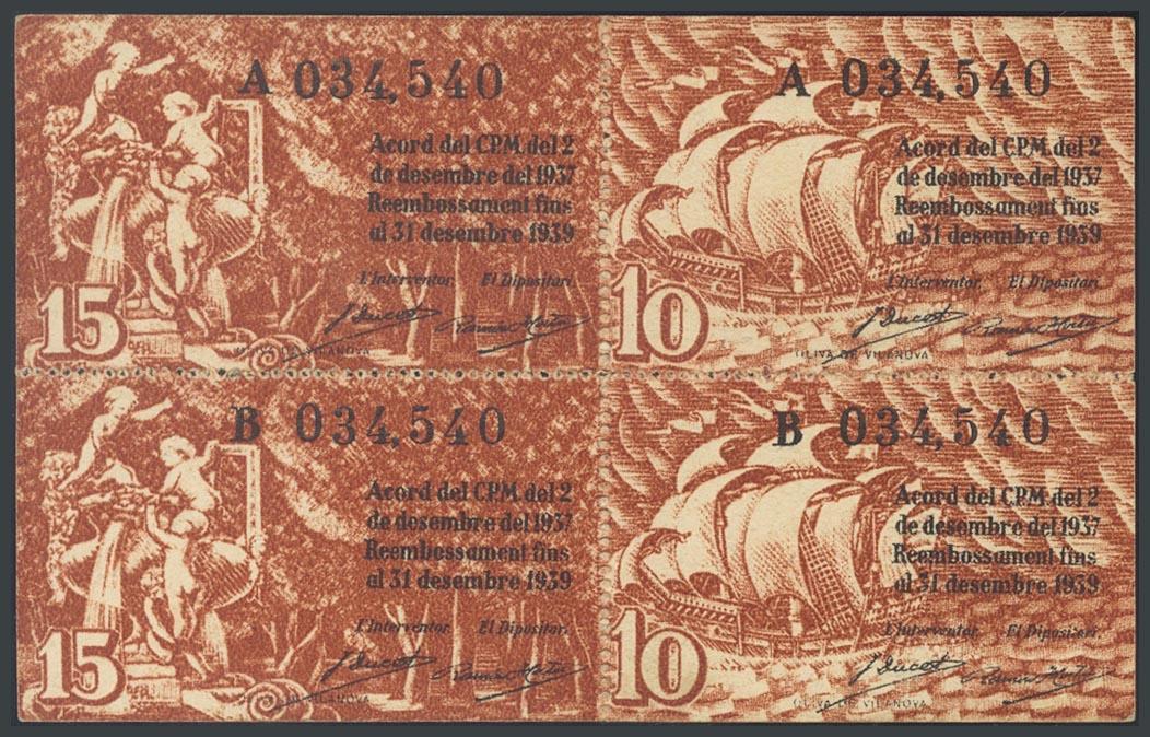 BARCELONA. 10 Céntimos (2) y 15 Céntimos (2). 2 de Diciembre de 1937. Serie A y B, Impreso en bloques de 4 billetes (dos de 10 cts y dos de 15 cts). (González: 6523/24). EBC.
