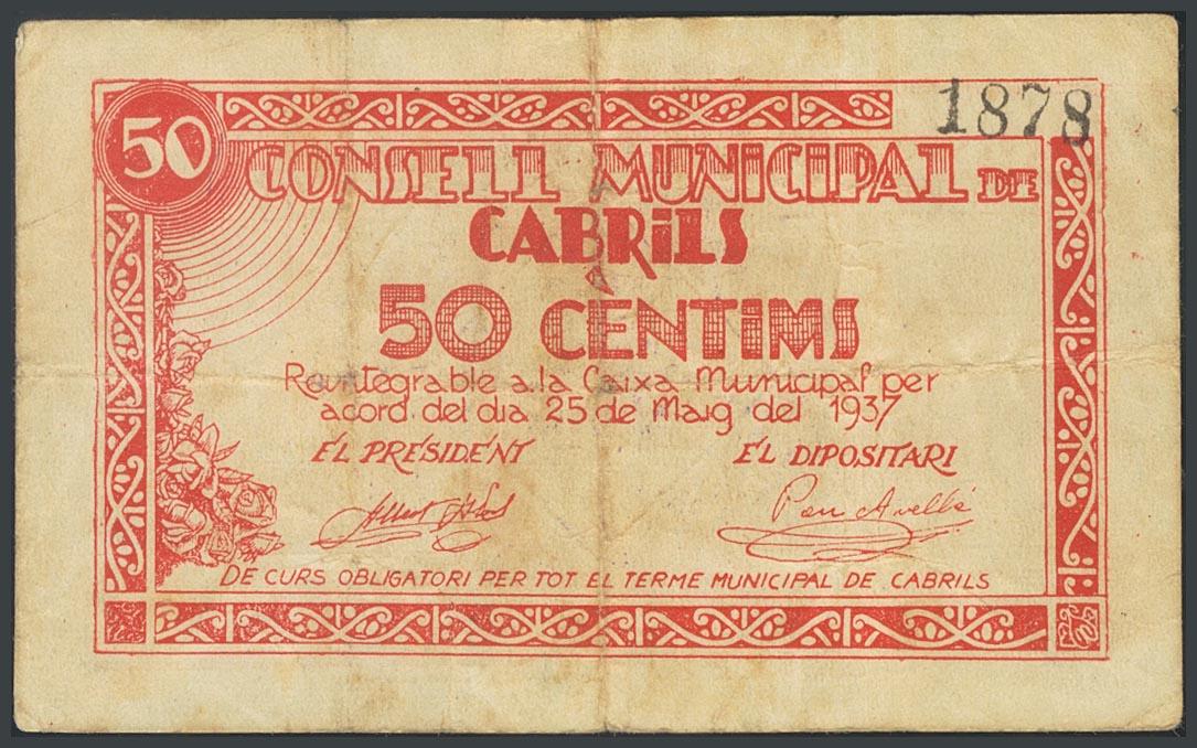CABRILS (BARCELONA). 50 Céntimos. Mayo 1937. (González: 7243). MBC.
