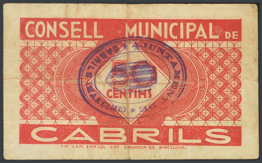 CABRILS (BARCELONA). 50 Céntimos. Mayo 1937. (González: 7243). MBC.