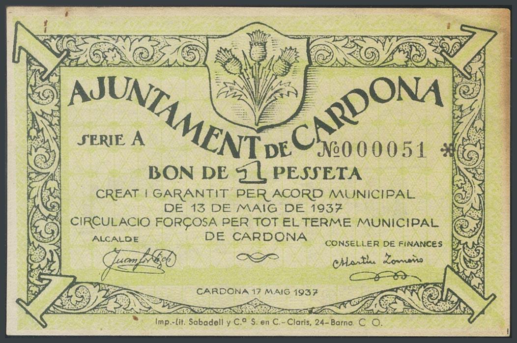 CARDONA (BARCELONA). 1 Peseta. 17 de Mayo de 1937. Serie A, numeración baja. (González: 7393). MBC.