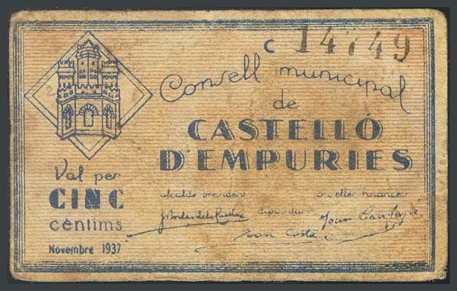 CASTELLO D´EMPURIES (GERONA). 5 Céntimos. Noviembre 1937. Serie C. (González: 7485). MBC+.