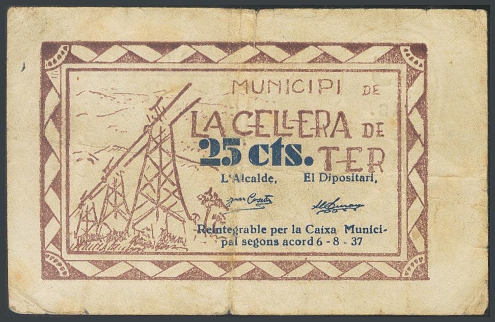 LA CELLERA (GERONA). 25 Céntimos. 6 de Agosto de 1937. (González: 7541). MBC.