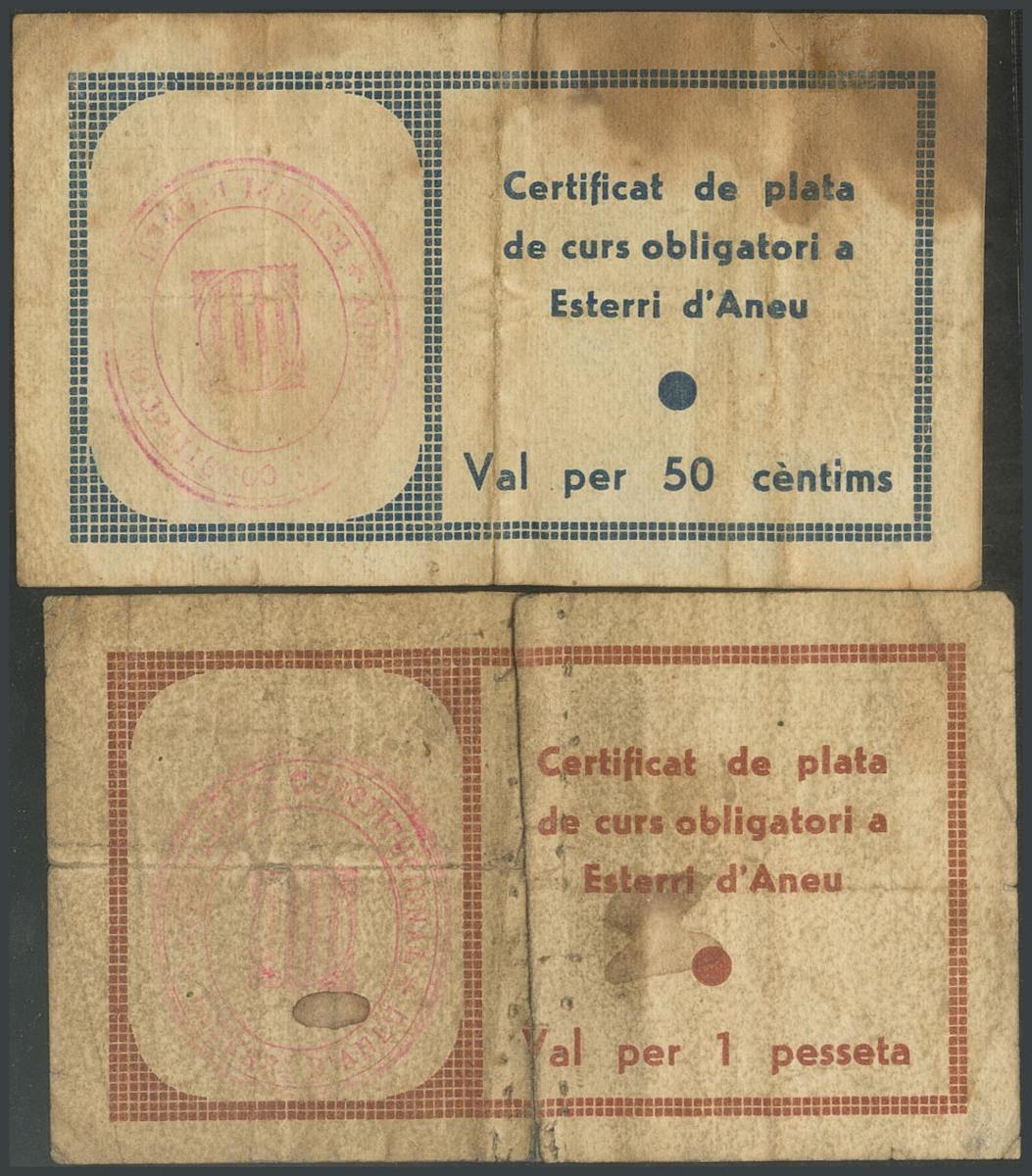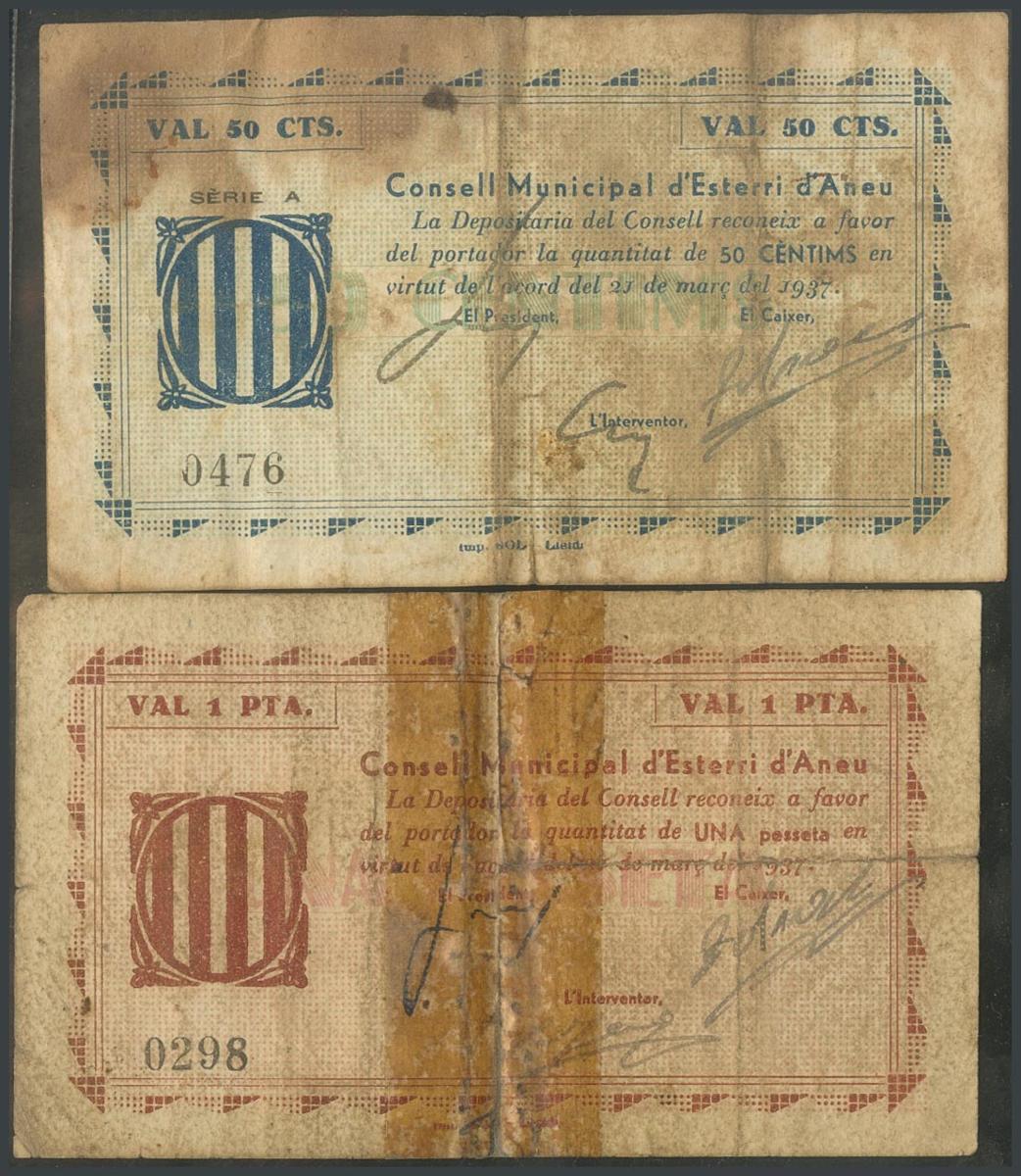 ESTERRI DE ANEU (LERIDA). 50 Céntimos y 1 Peseta. 21 de Marzo de 1937. Serie A y sin serie, respectivamente. (González: 7800, 7802). Raros, el de 1 Peseta con presencia de cinta adhesiva. BC-/RC.