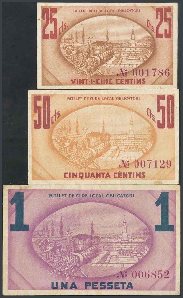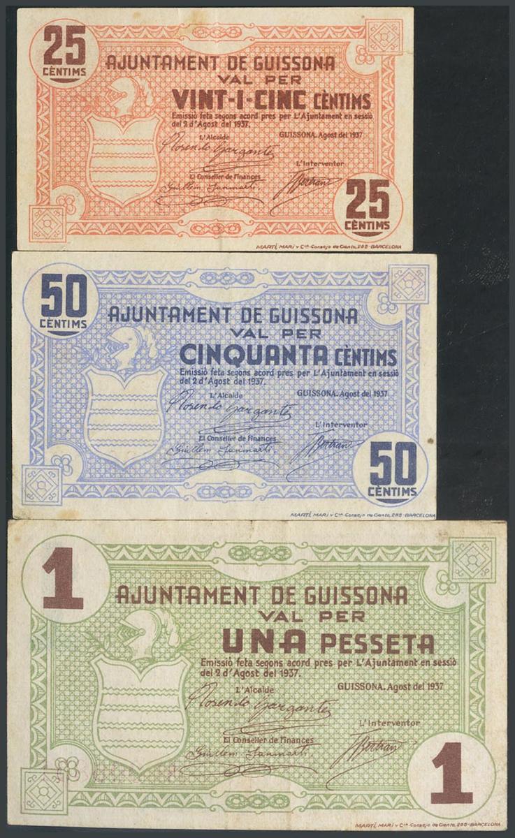 GUISSONA (LERIDA). 25 Céntimos, 50 Céntimos y 1 Peseta. 2 de Agosto de 1937. (González: 8179/81). MBC+/EBC.
