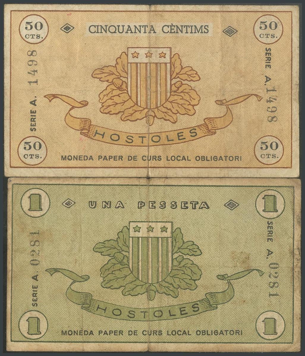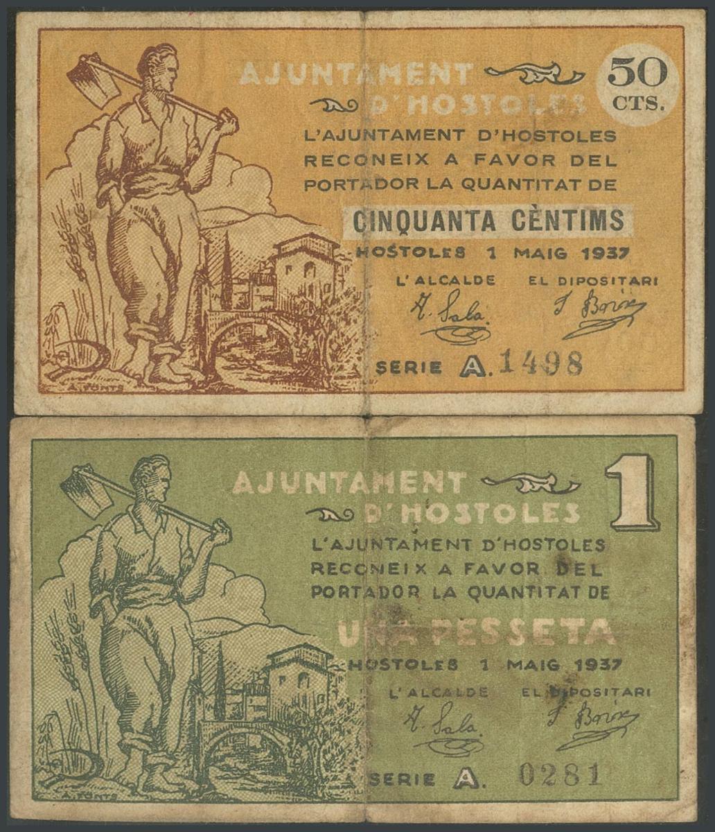 HOSTOLES (GERONA). 50 Céntimos y 1 Peseta. 1 de Mayo de 1937. Serie A, ambos. (González: 8234/35). Inusuales. BC.