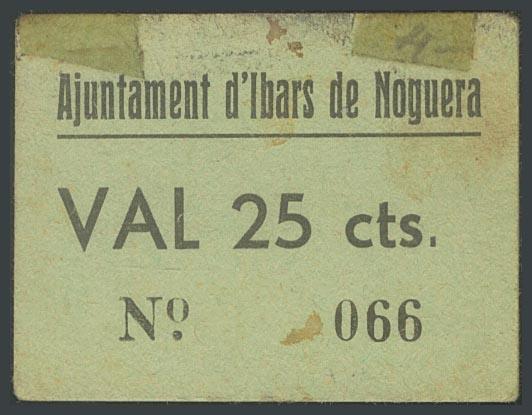 IBARS DE NOGUERA (LERIDA). 25 Céntimos. (1938ca). (González: 8240). Muy raro. MBC.