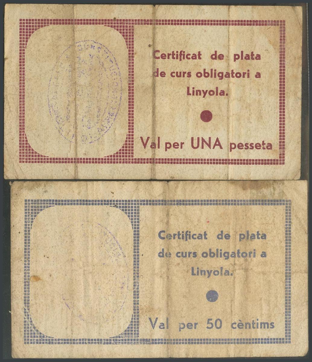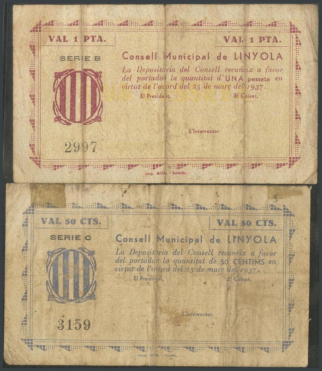 LINYOLA (LERIDA). 50 Céntimos y 1 Peseta. 25 de Marzo de 1937. Series C y B, respectivamente. (González: 8315, 8316). Raros. MBC-/BC+.