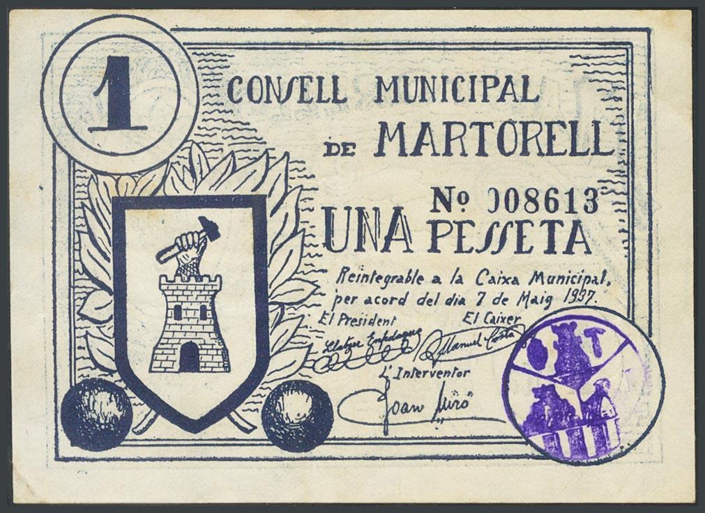 MARTORELL (BARCELONA). 1 Peseta. 7 de Mayo de 1937. (González: 8579). EBC.