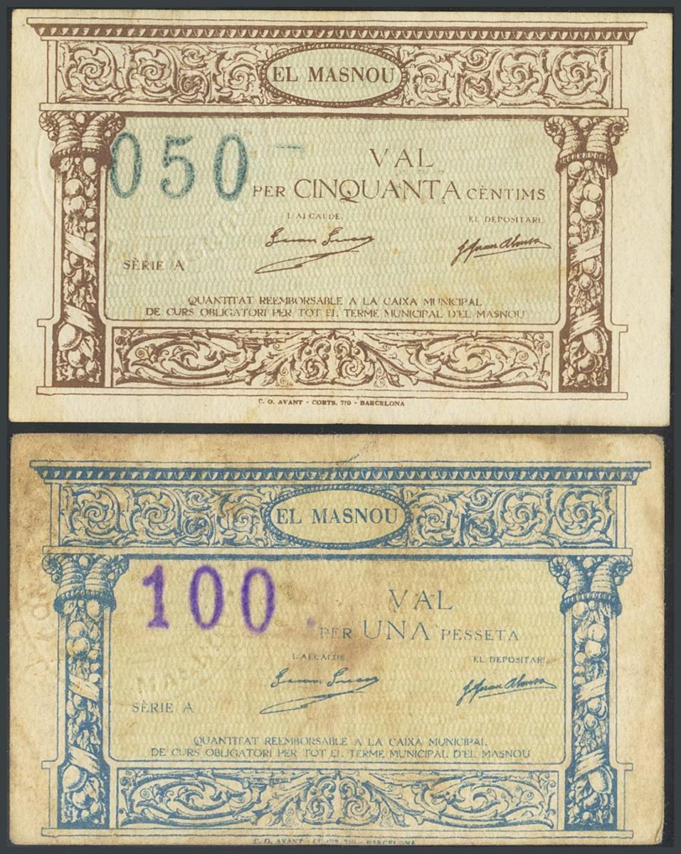 MASNOU (BARCELONA). 50 Céntimos y 1 Peseta. (1937ca). Serie A, ambos. (González: 8606, 8607). MBC.