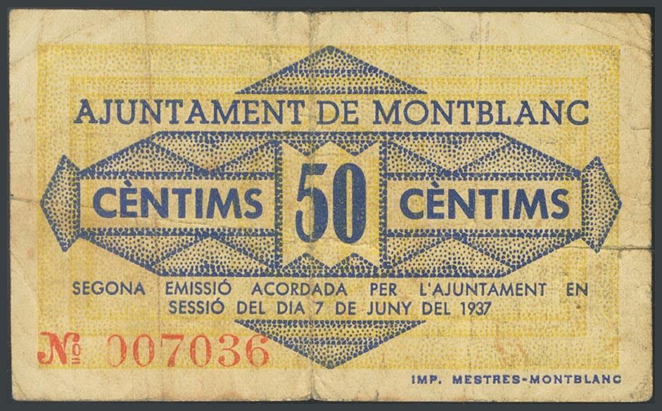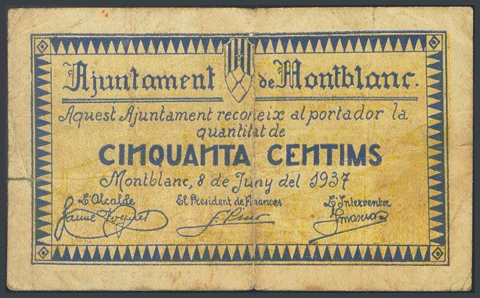 MONTBLANC (TARRAGONA). 25 Céntimos. 8 de Junio de 1937. (González: 8749). MBC.