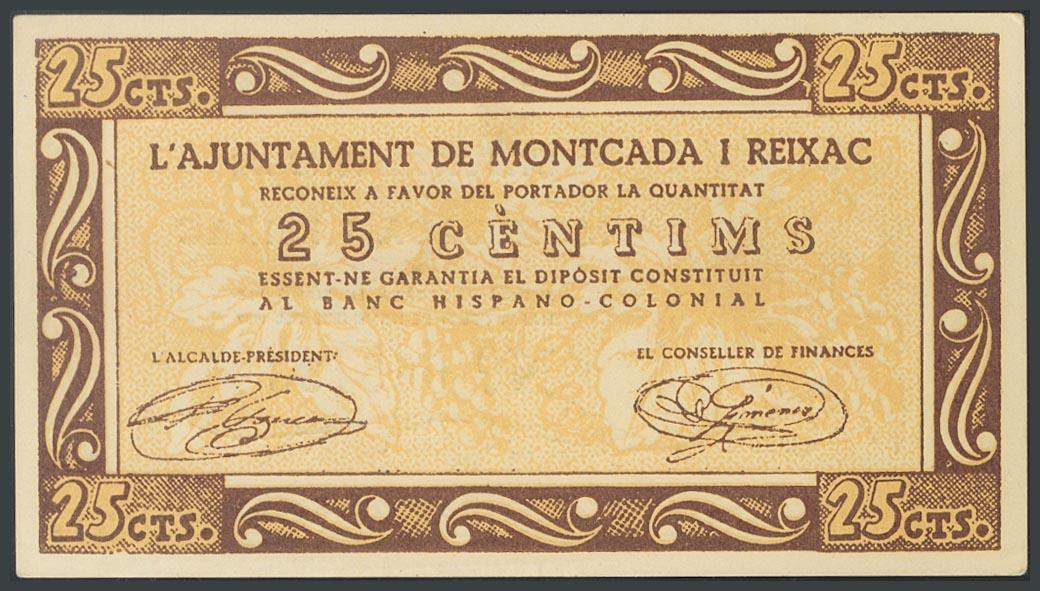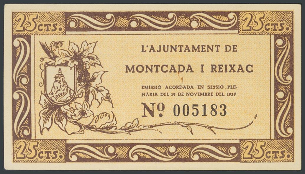 MONTCADA I REXAC (BARCELONA). 25 Céntimos. 19 de Noviembre de 1937. (González: 8776). EBC+.