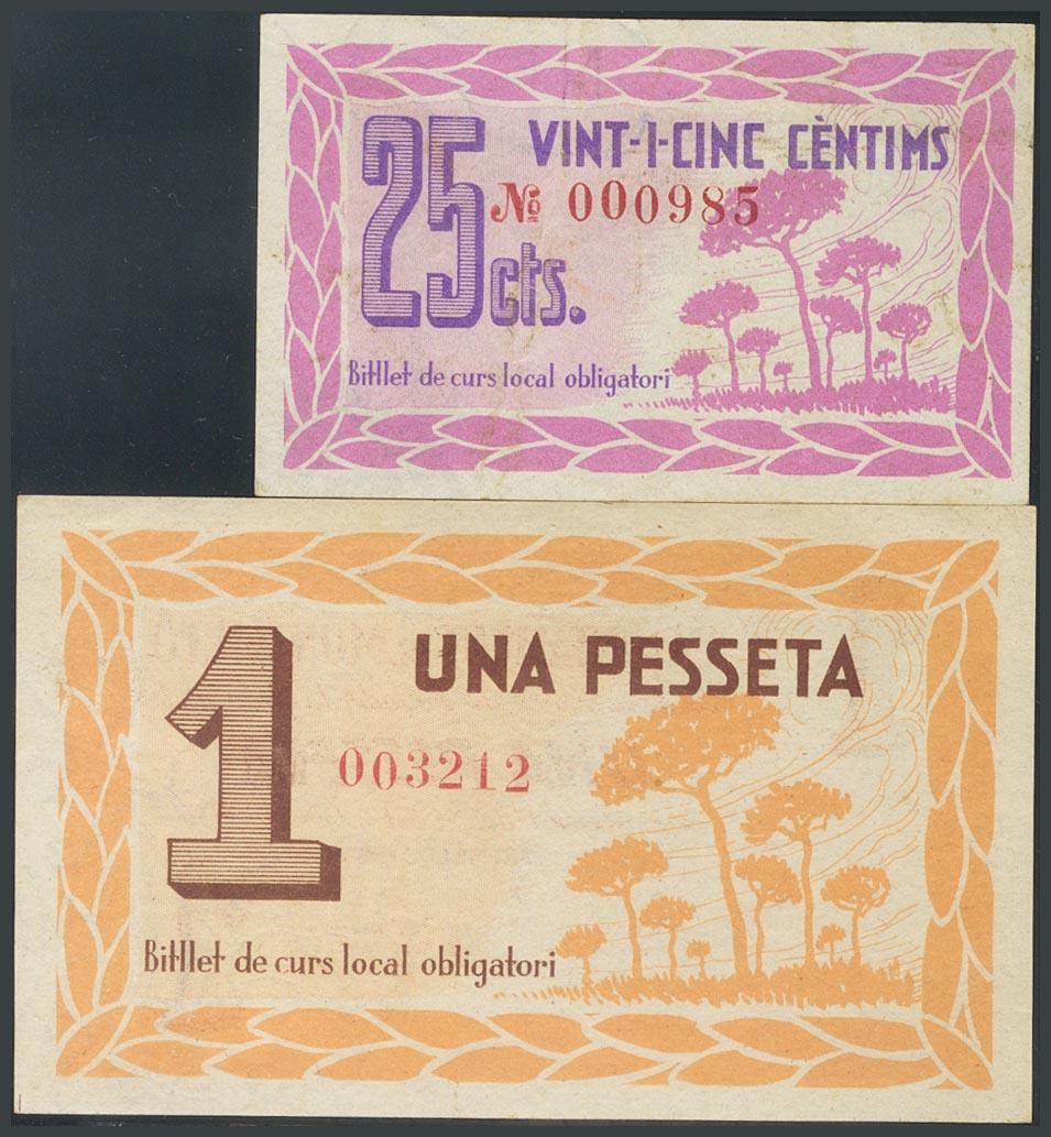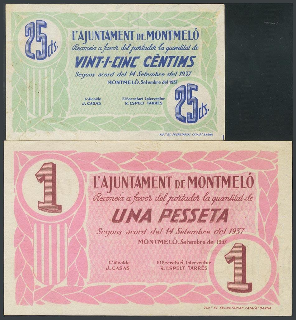 MONTMELO (BARCELONA). 25 Céntimos y 1 Peseta. 14 de Septiembre de 1937. (González: 8805, 8807). EBC.