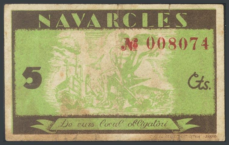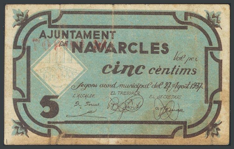 NAVARCLES (BARCELONA). 5 Céntimos. 27 de Agosto de 1937. (González: 8878). BC.
