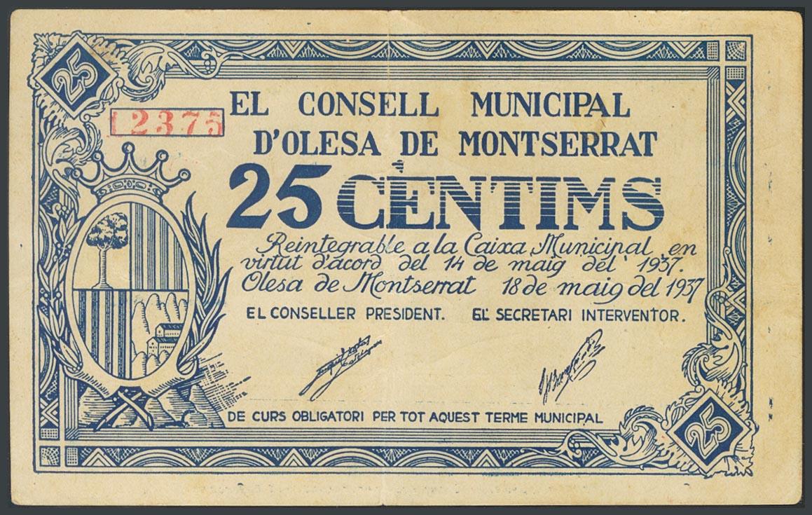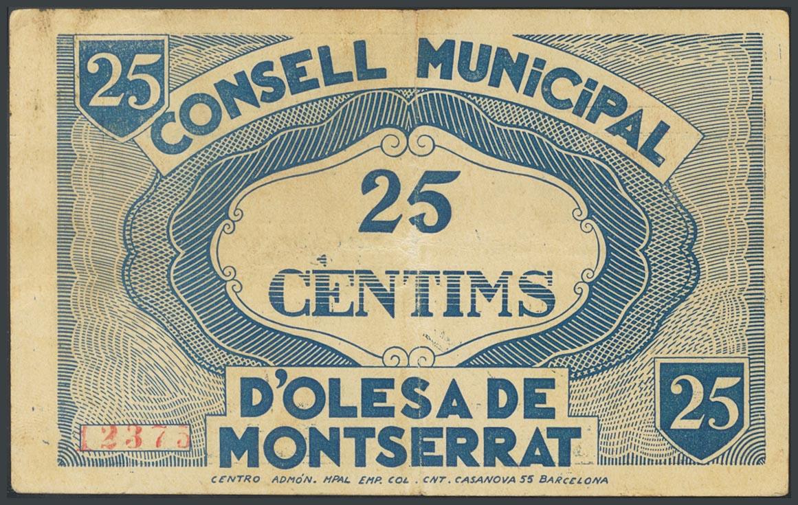 OLESA DE MONTSERRAT (BARCELONA). 25 Céntimos. 18 de Mayo de 1937. (González: 8922). MBC.