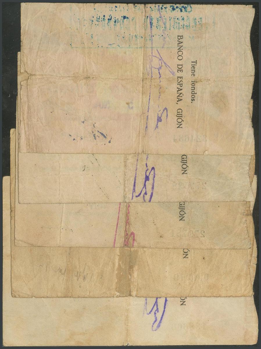 Serie completa del Banco de España, surcursal de Gijón emitida el 5 de Noviembre de 1936, que incluye los billetes de 5 Pesetas, 10 Pesetas, 25 Pesetas, 50 Pesetas y 100 Pesetas. (Edifil 2017: 380/84). BC/MBC.