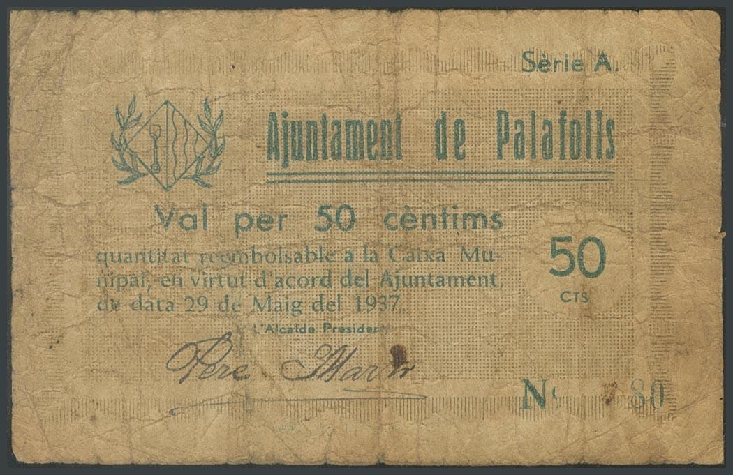 PALAFOLLS (BARCELONA). 50 Céntimos. 29 de Mayo de 1937. Serie A. (González: 9065). Raro. RC.