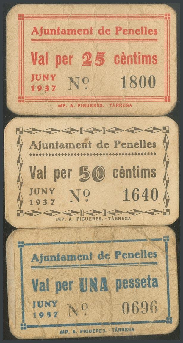PENELLES (LERIDA). 25 Céntimos, 50 Céntimos y 1 Peseta. Junio 1937. (González: 9183/85). Inusuales. MBC.