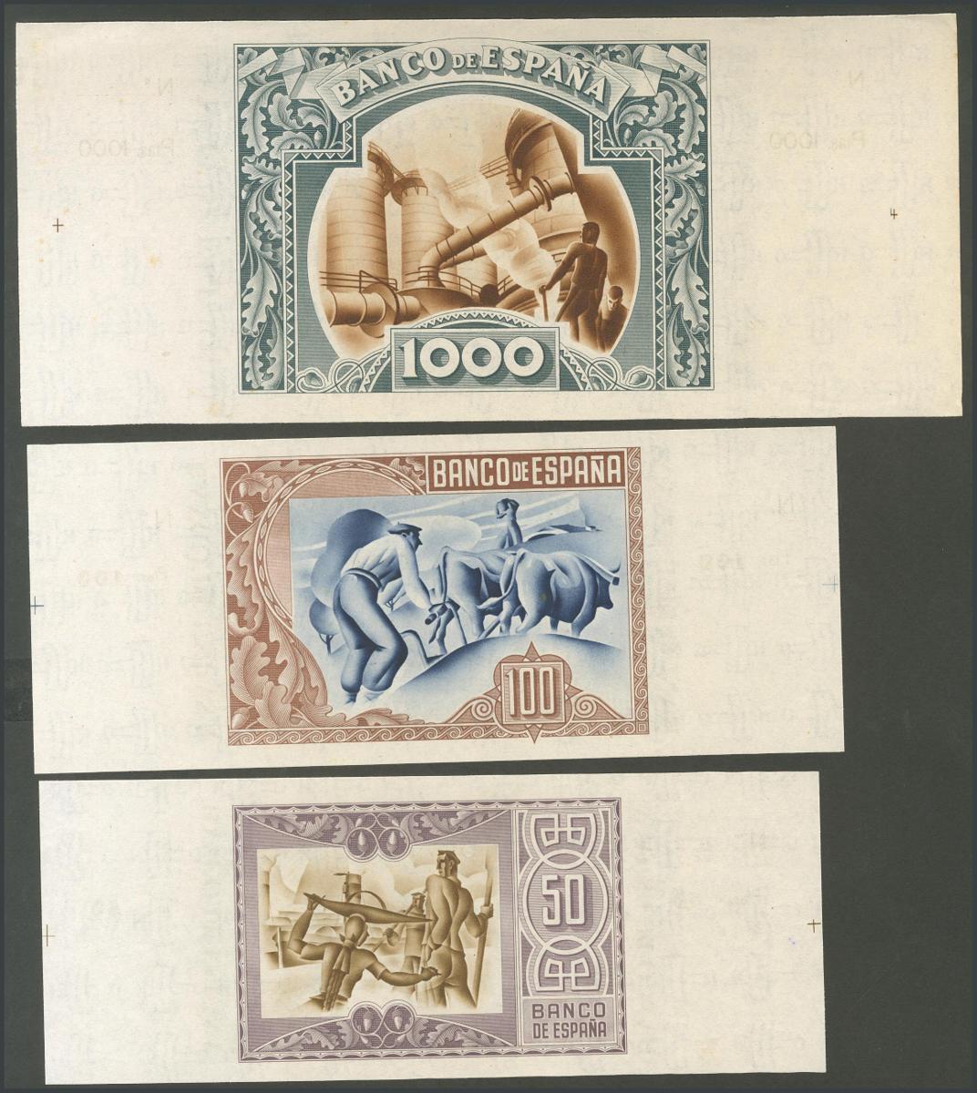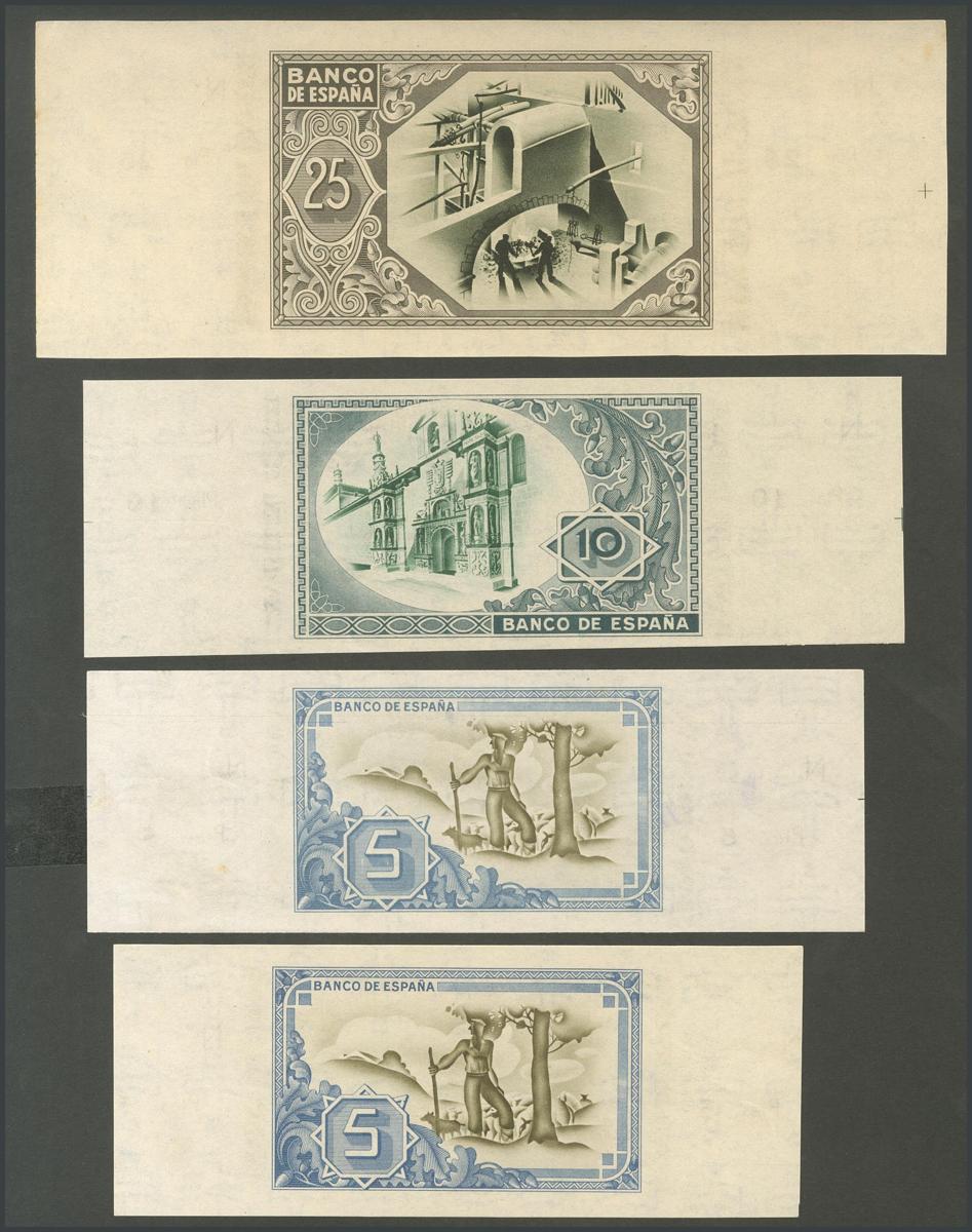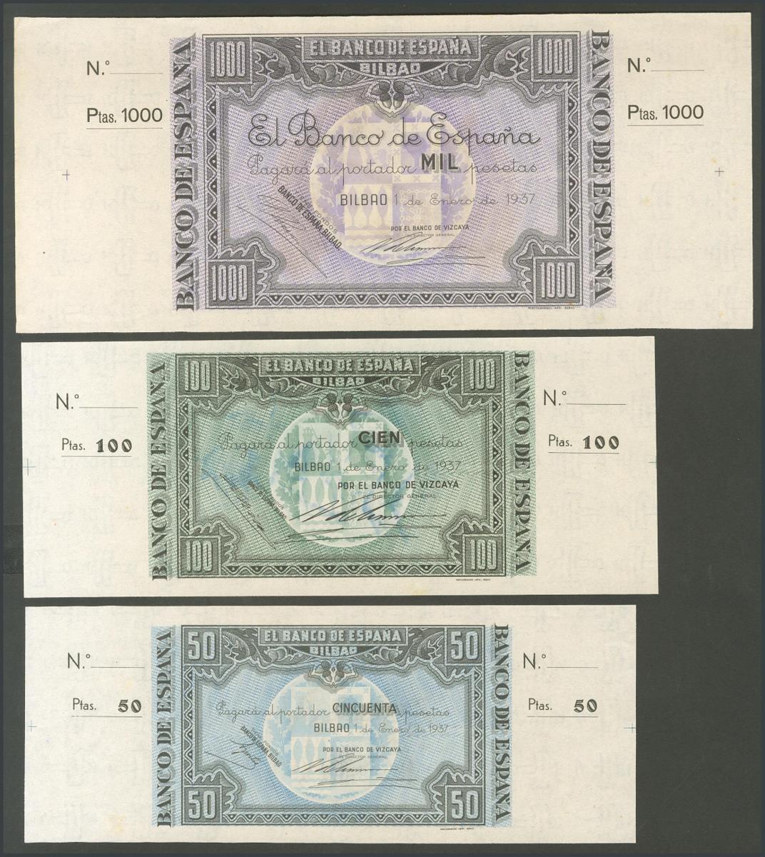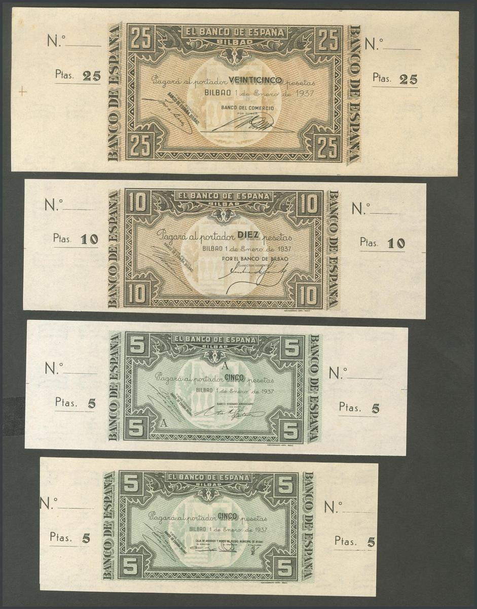 Serie completa, a falta del valor NO EMITIDO de 500 Pesetas e incluyendo el de 5 Pesetas (sin serie y serie A), 10 Pesetas, 25 Pesetas, 50 Pesetas, 100 Pesetas y 1000 Pesetas (este último valor no emitido). 1 de Enero de 1937. Banco de España, sucursal de Bilbao y con diferentes antefirmas. Sin serie (excepto uno de 5 Pesetas), con ambas matrices y sin numeración. (Edifil 2017: 385a, 386a, 387a, 388b, 389f, 390b, NE27g). EBC/EBC+.