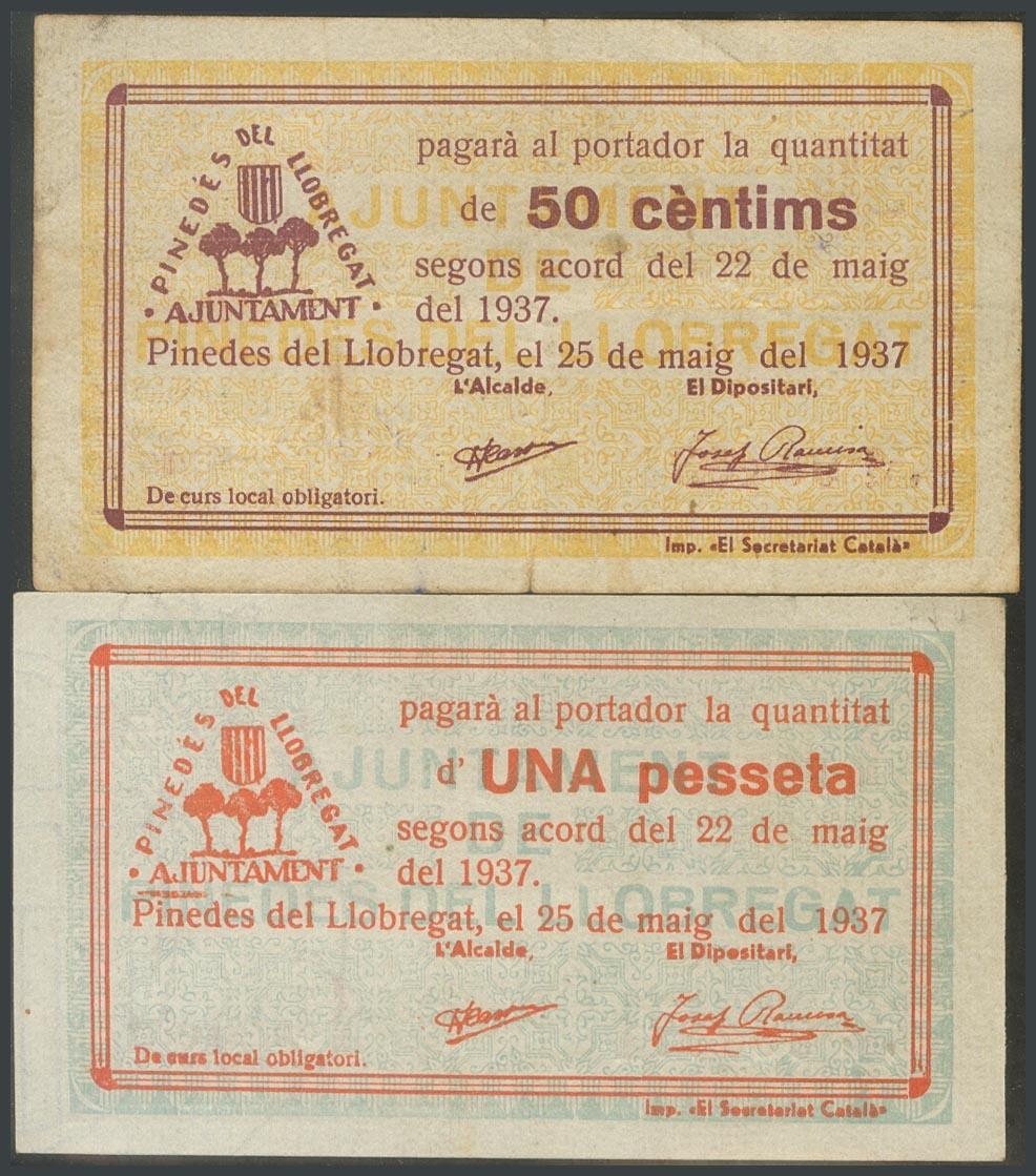PENEDES DEL LLOBREGAT (BARCELONA). 50 Céntimos y 1 Peseta. Mayo 1937. Serie A y B, respectivamente. (González: 9229/30). MBC+/EBC.