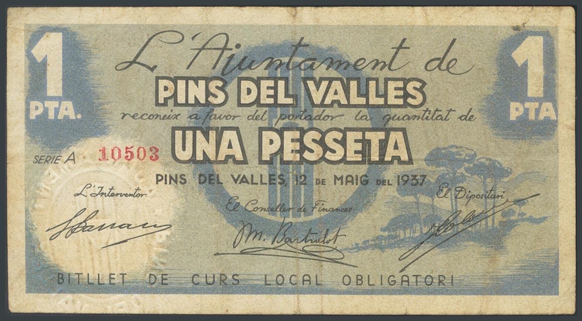 PINS DEL VALLES (BARCELONA). 1 Peseta. 12 de Mayo de 1937. Serie A. (González: 9245). BC.