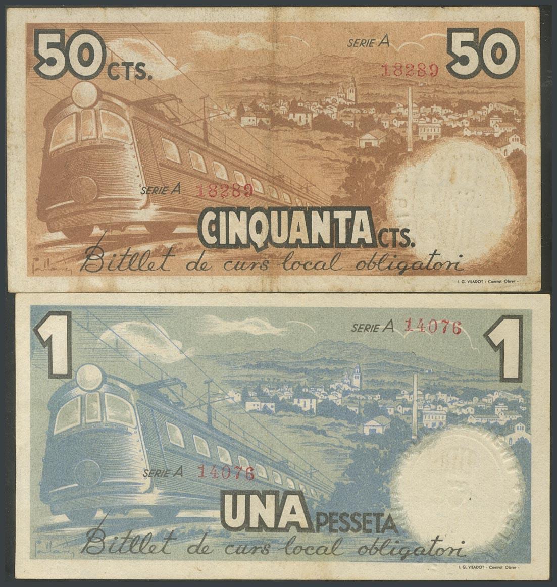 PINS DEL VALLES (BARCELONA). 50 Céntimos y 1 Peseta. 12 de Mayo de 1937. Serie A, ambos. (González: 9244/45). MBC+.