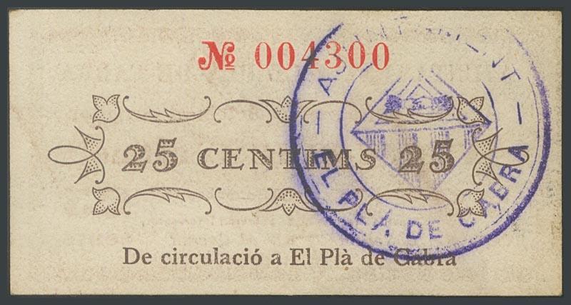 PLA DE CABRA (TARRAGONA). 25 Céntimos. 10 de Septiembre de 1937. (González: 9249). Raro. EBC.