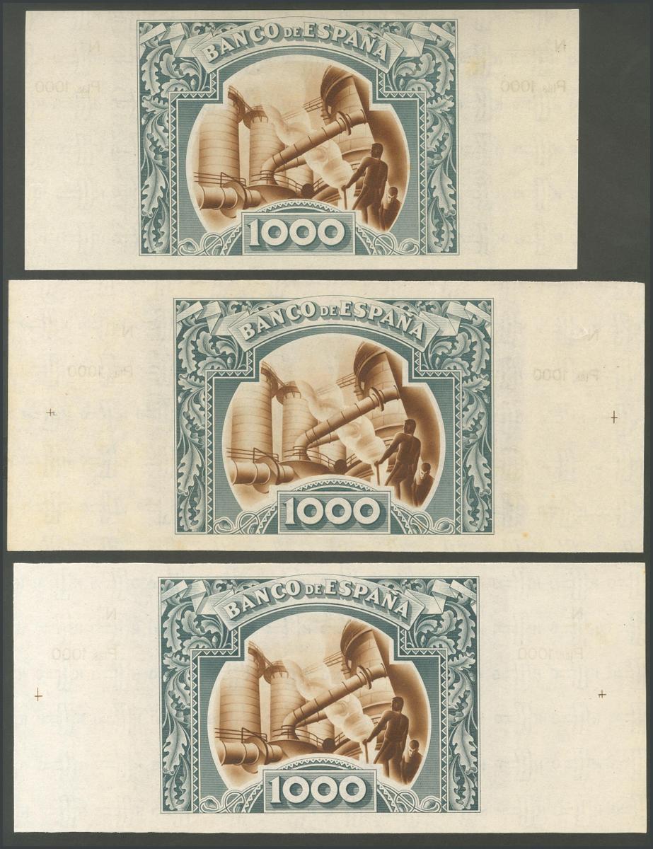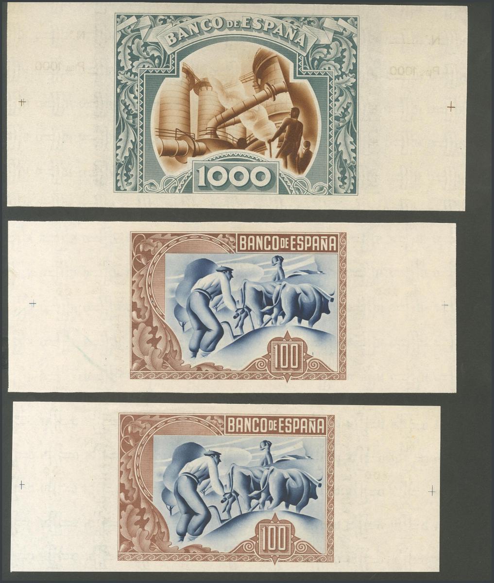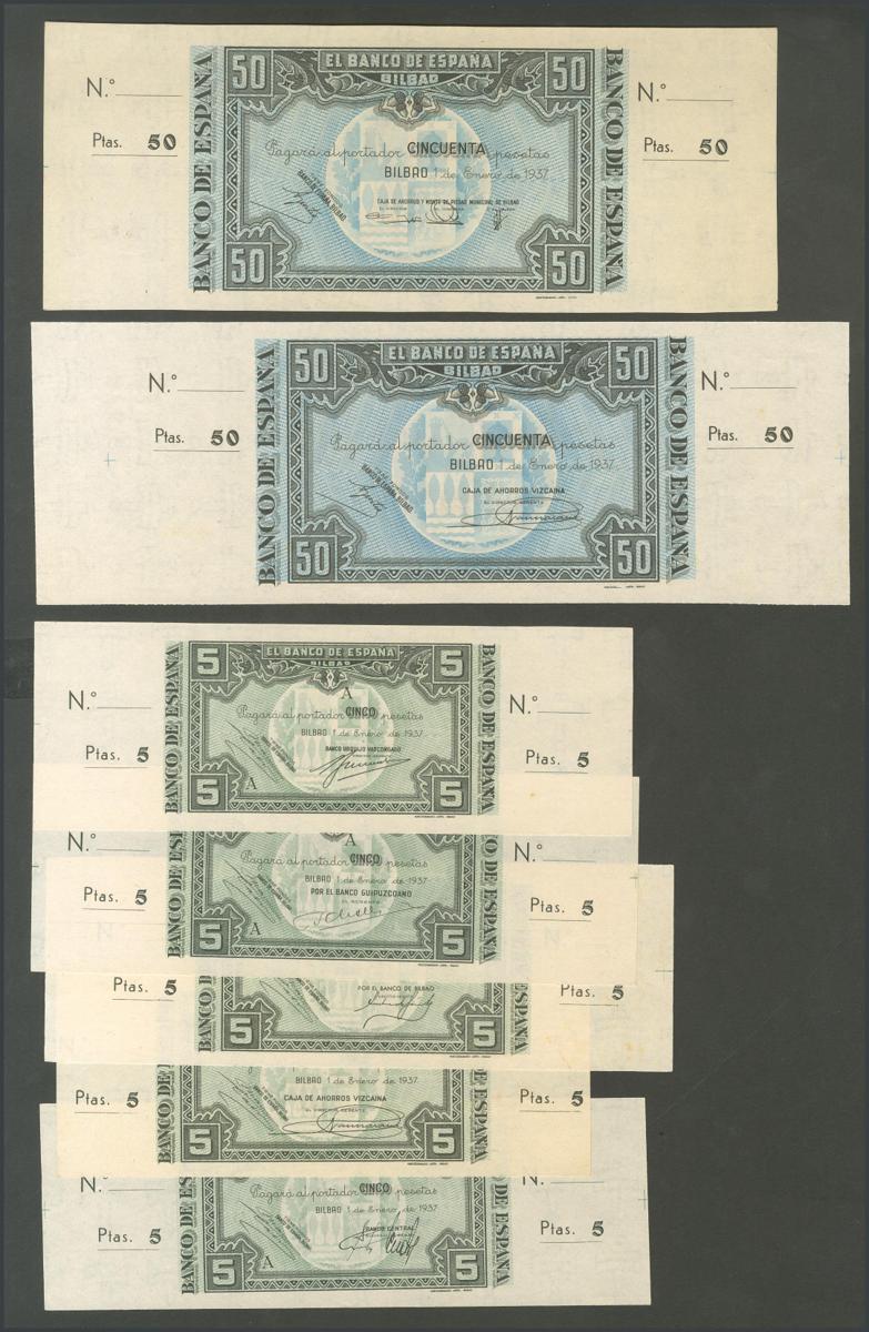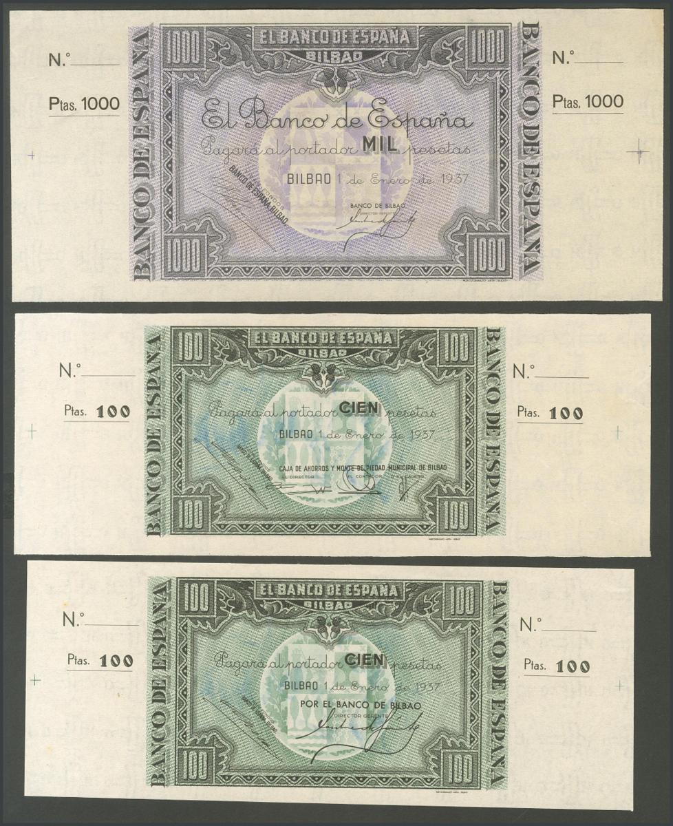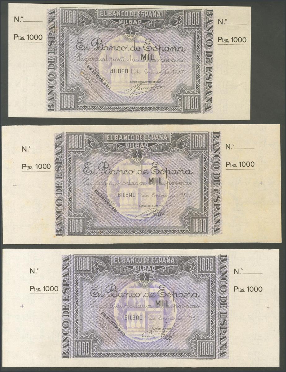 Conjunto de 13 billetes del Banco de Bilbao, emitidos el 1 de Enero de 1937 del 5 Pesetas sin serie (2), 5 Pesetas serie A (3), 50 Pesetas (2), 100 Pesetas (2) y 1000 Pesetas (4), todos ellos con diferentes antefirmas. (Edifil 2017: 385b, 385c, 386b, 386c, 386f, 389b, 389c, 390a, 390c, NE26a, NE26b, NE26c, NE26f). Algunos con las habituales manchitas de escasa consideración. EBC+/SC-.