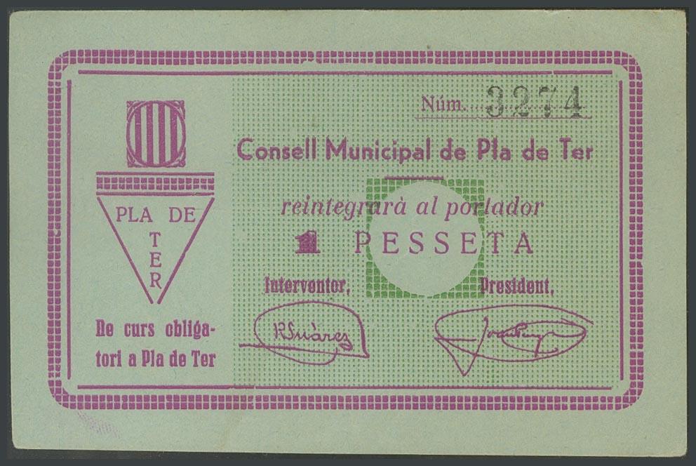 PLA DE TER (GERONA). 1 Peseta. (1938ca). (González: 9260). Inusual. EBC+.