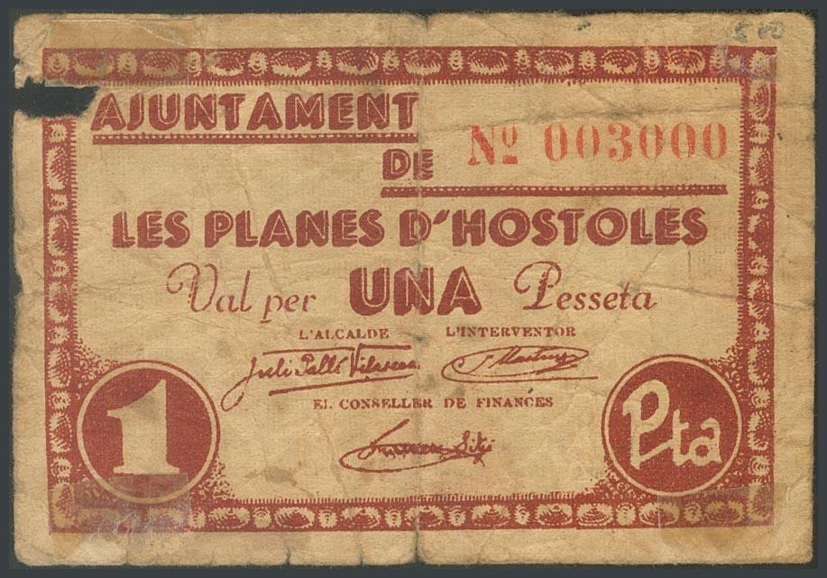 PLANES DE HOSTOLES (GERONA). 1 Peseta. (1938ca). (González: 9277). Raro. RC.