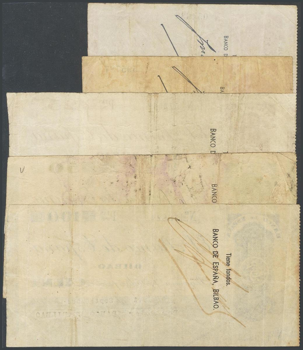 Serie completa de 5 billetes del Banco de Bilbao, emitidos el 30 de Agosto de 1936 de 5 Pesetas (sin serie y serie A), 25 Pesetas, 50 Pesetas y 100 Pesetas. (Edifil 2017: 368f, 368Ac, 369a, 370a, 371f). MBC+/MBC-.