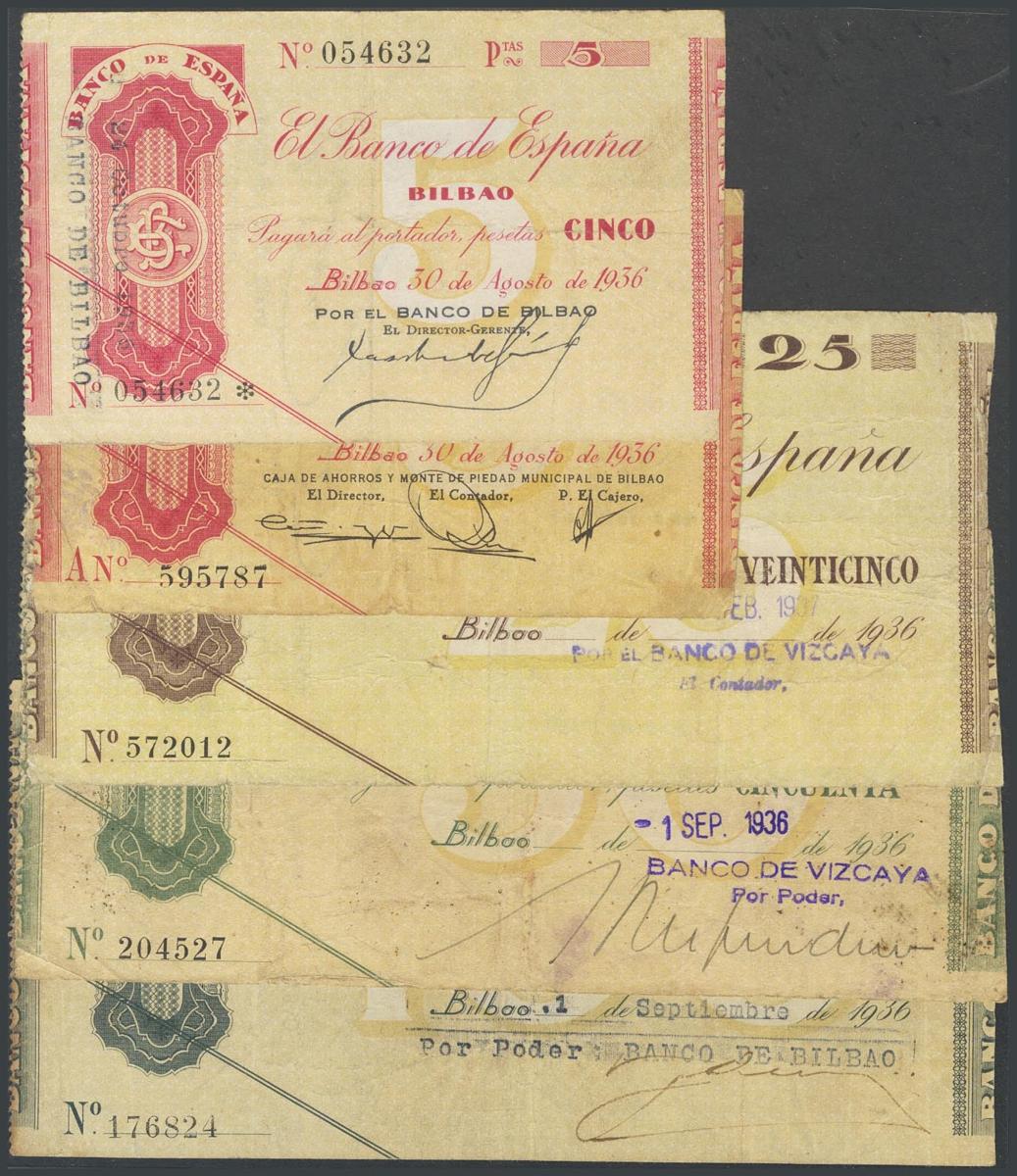 Serie completa de 5 billetes del Banco de Bilbao, emitidos el 30 de Agosto de 1936 de 5 Pesetas (sin serie y serie A), 25 Pesetas, 50 Pesetas y 100 Pesetas. (Edifil 2017: 368f, 368Ac, 369a, 370a, 371f). MBC+/MBC-.