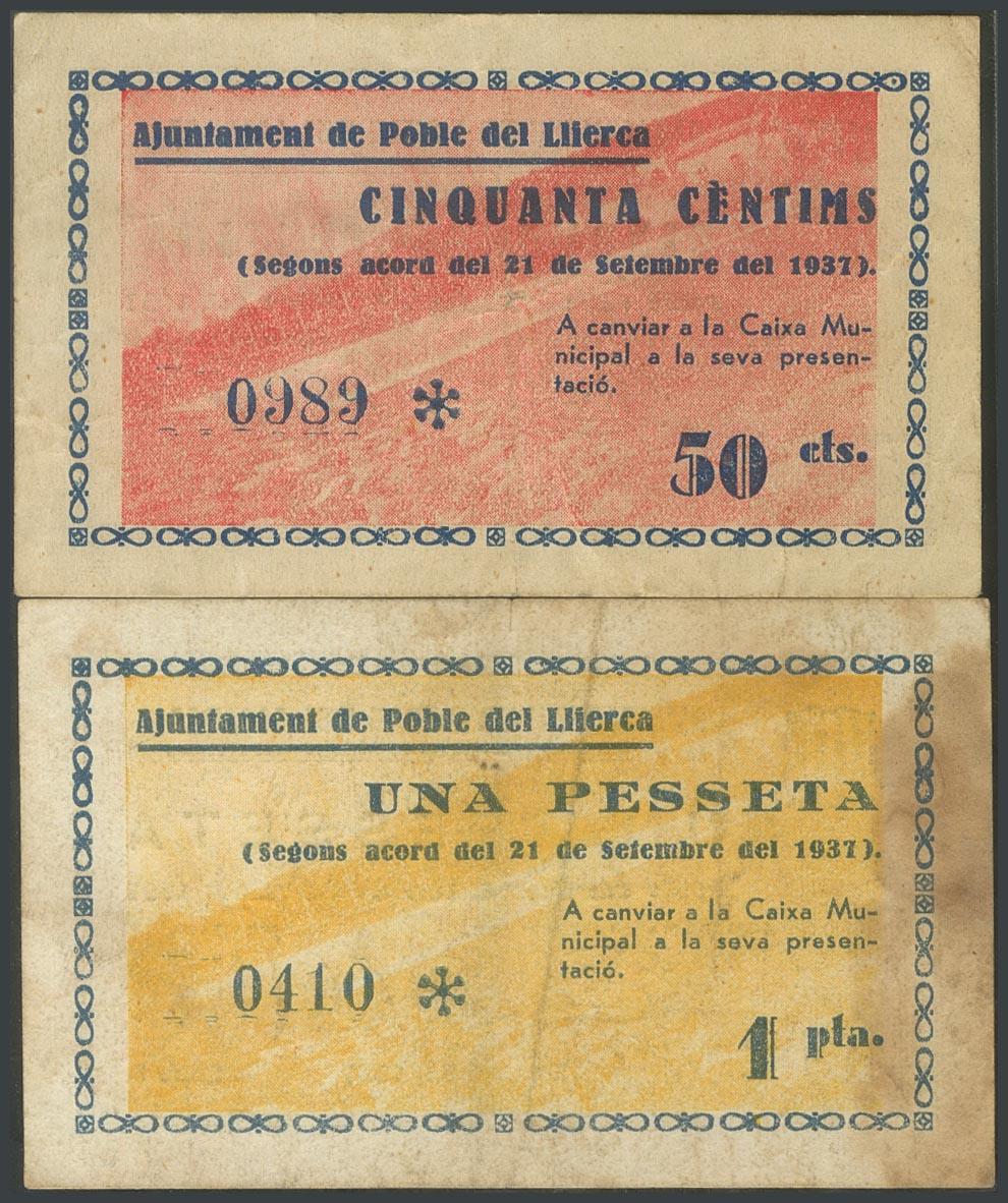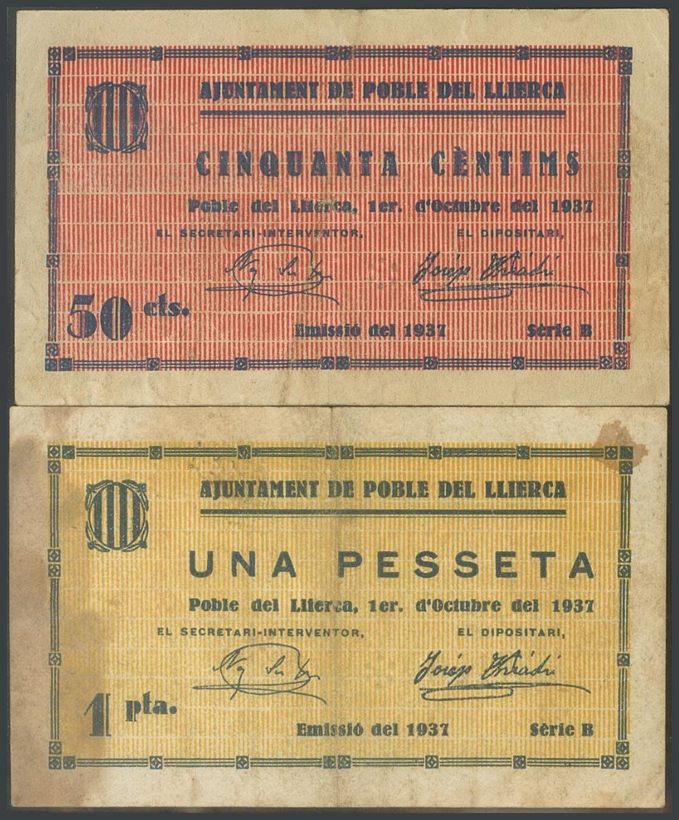 POBLE DEL LLIERCA (GERONA). 50 Céntimos y 1 Peseta. 1 de Octubre de 1937. Serie B, ambos. (González: 9355, 9356). Raros. MBC-/BC-.