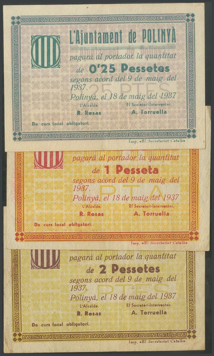POLINYA (BARCELONA). 25 Céntimos, 1 Peseta y 2 Pesetas. 18 de Mayo de 1937. (González: 9360/62). Raros. MBC.