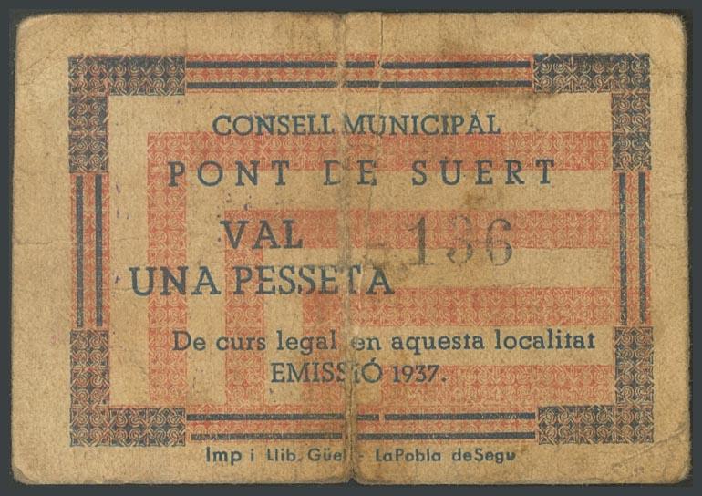 PONT DE SUERT (LERIDA). 1 Peseta. 1937. (González: 9380). Raro. RC.
