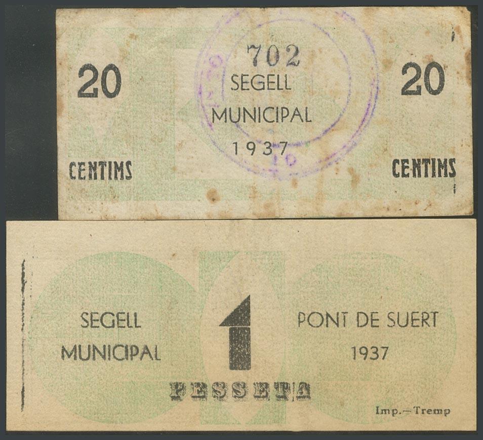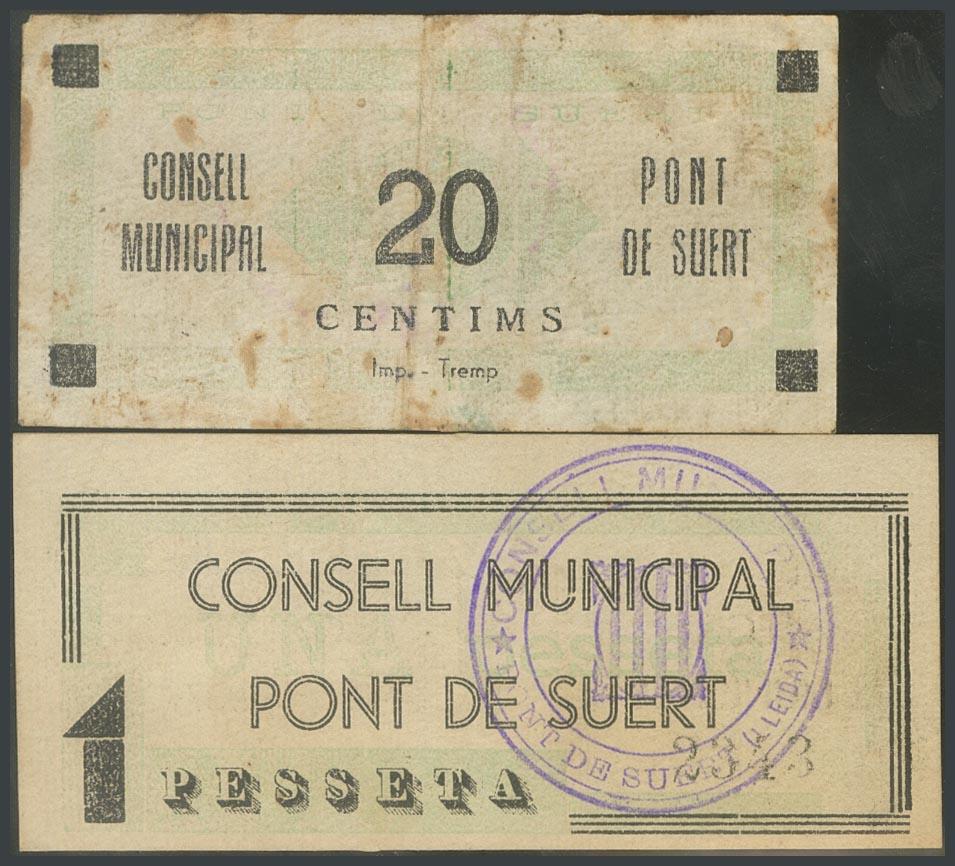 PONT DE SUERT (LERIDA). 20 Céntimos y 1 Peseta. 1937. (González: 9381/82). Raros. MBC/EBC+.