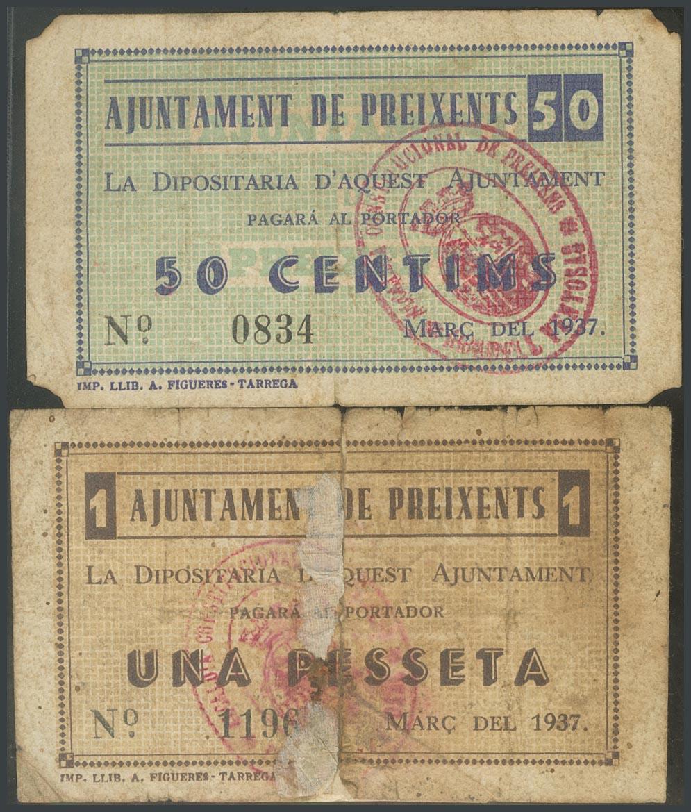 PREIXENTS (LERIDA). 50 Céntimos y 1 Peseta. Marzo 1937. (González: 9447/48). Muy raros, con presencia de cinta adhesiva en el valor de 1 pts. RC.