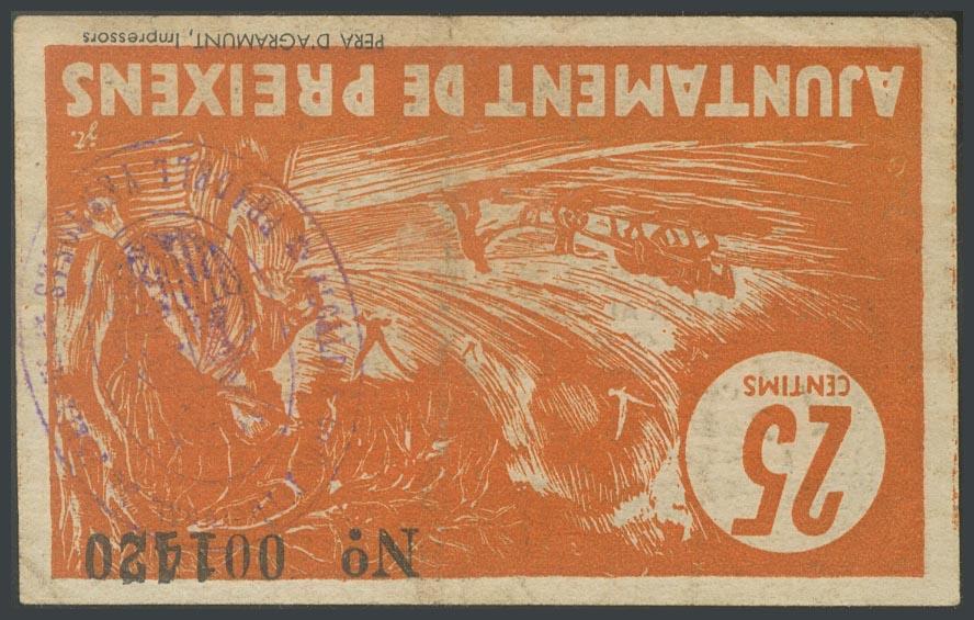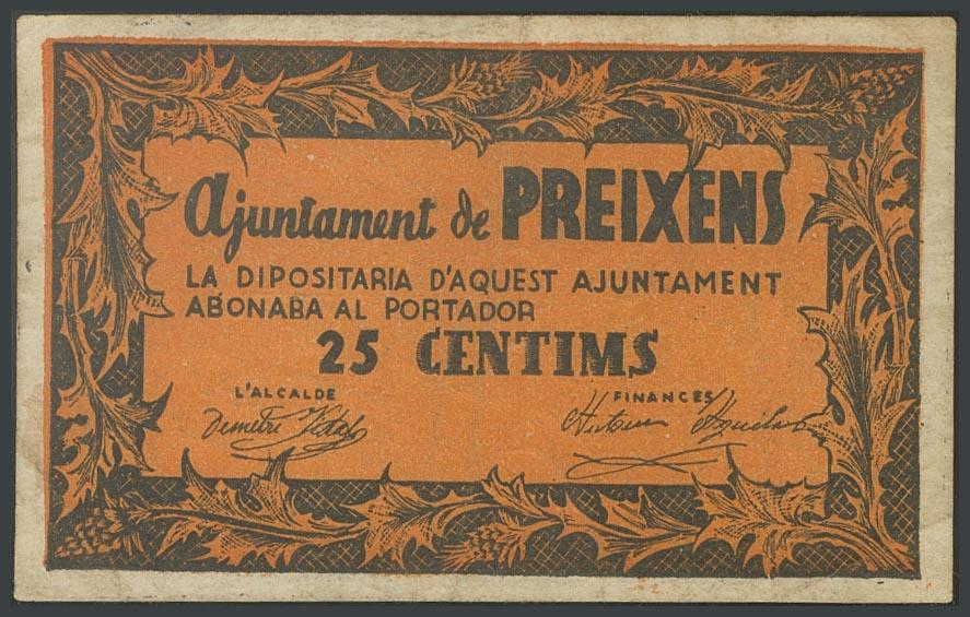 PREIXENS (LERIDA). 25 Céntimos. (1937ca). (González: 9449). Muy raro. MBC.