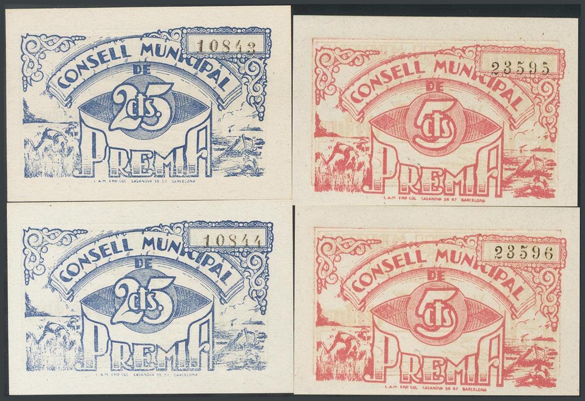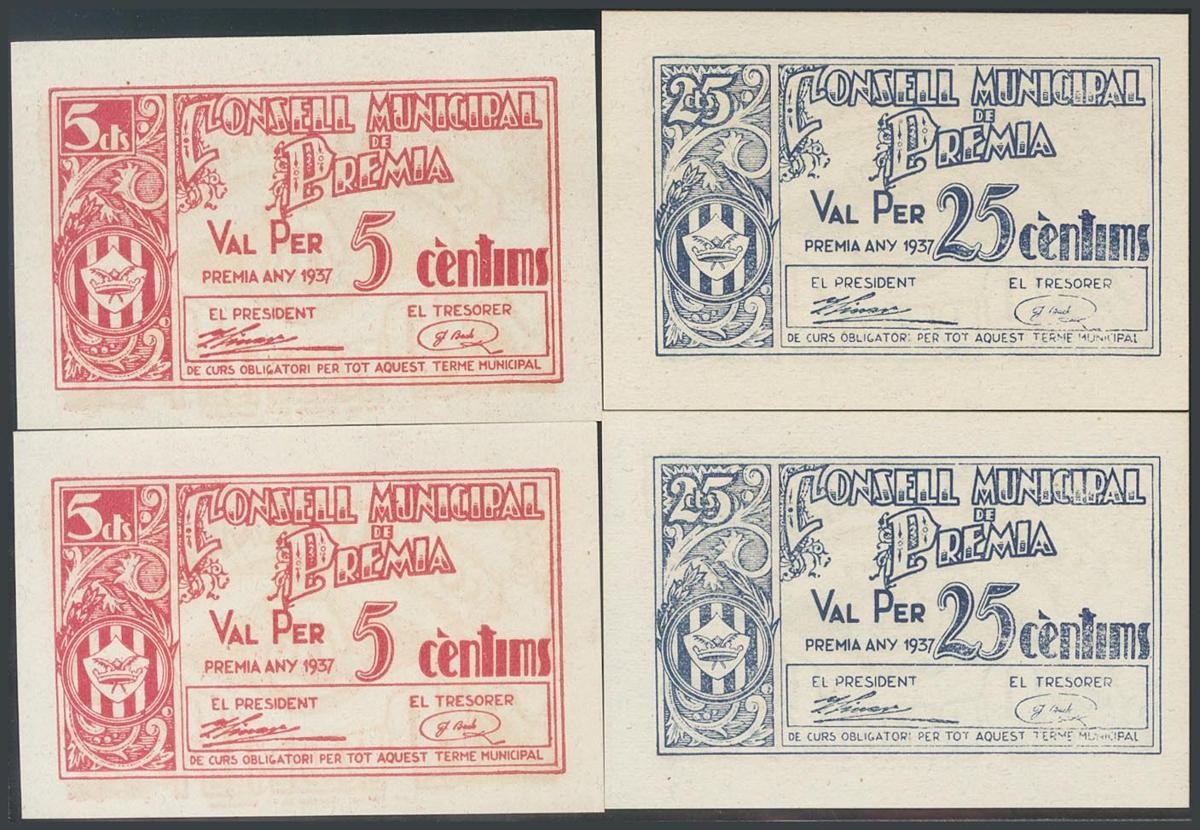 PREMIA (BARCELONA). 5 Céntimos y 25 Céntimos. 1937. Parejas correlativas. (González: 9456/57). SC.