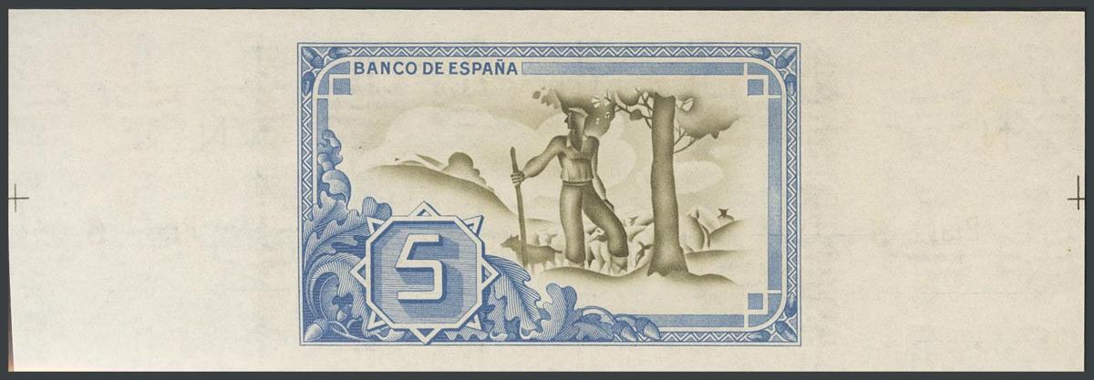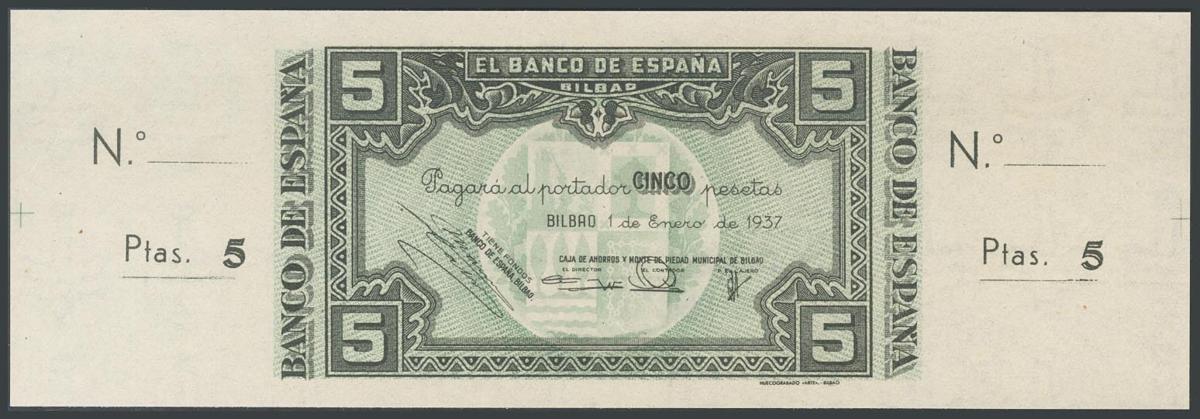 5 Pesetas. 1 de Enero de 1937. Sucursal de Bilbao, antefirma Caja de Ahorros y Monte de Piedad Municipal de Bilbao. Sin serie y sin numeración, con ambas matrices. (Edifil 2017: 385a). SC.