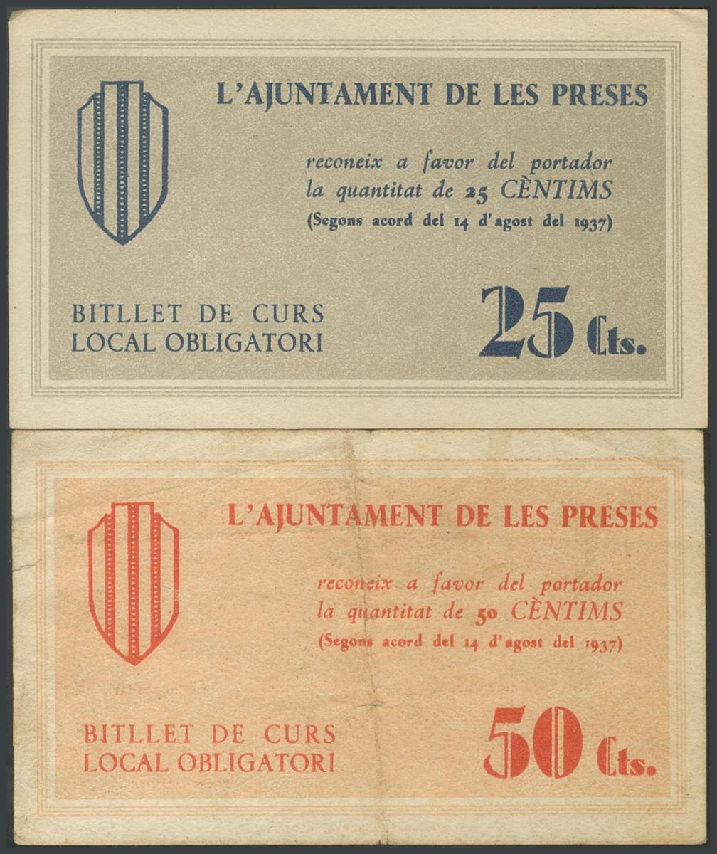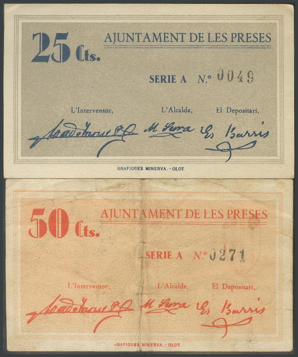 PRESES (GERONA). 25 Céntimos y 50 Céntimos. 14 de Agosto de 1937. Serie A, ambos. (González: 9472, 9473). El 25 Céntimos raro y el 50 Céntimos muy raro. EBC/BC.