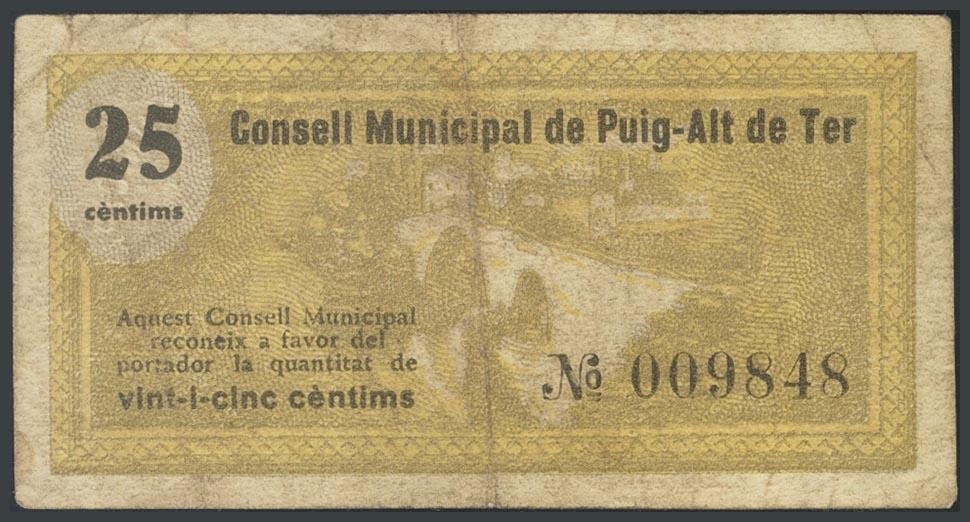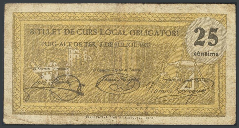 PUIG-ALT DE TER (GERONA). 25 Céntimos. 4 de Julio de 1937. (González: 9478). BC+.