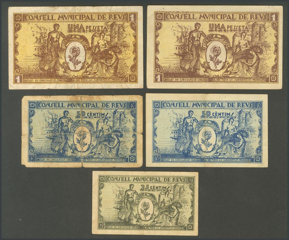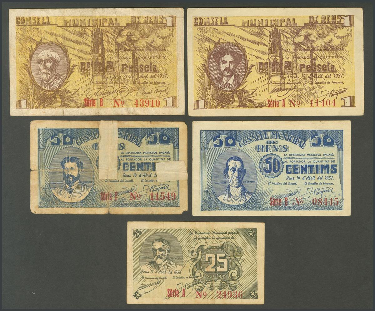 REUS (TARRAGONA). 25 Céntimos, 50 Céntimos (2) y 1 Peseta (2). 14 de Abril de 1937. Serie A el de 25 cts, serie B y F, respectivamente el de 50 Céntimos y serie A y B, respectivamente el de 1 Peseta. (González: 9558, 9555, 9559, 9560, 9561). EBC-/MBC (excepto el 9559 que es RC con presencia de cinta adhesiva).