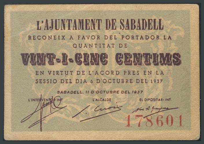 SABADELL (BARCELONA). 25 Céntimos. 11 de Octubre de 1937. (González: 9778). EBC.